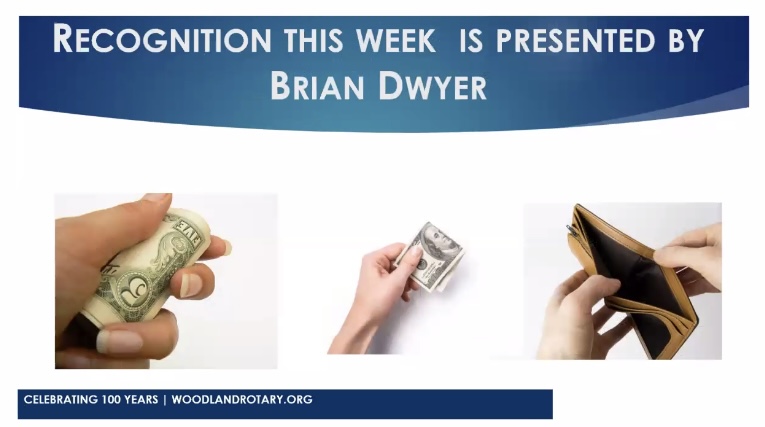 Tom Schwarzgruber, Clyde Brooker and Chuck Maltese were in the Century Spotlight today. Tom Schwarzgruber was especially grateful for Rotary's work internationally as well as here locally. Clyde Brooker initially joined to expand his professional network, but eventually decided to remain in the Club for the comradery. Chuck Maltese first became a Rotarian in 1965 in Warren MI. When he transferred his membership here, he got 6 months of free lunches, courtesy of Steve Venables, before his membership paperwork got processed. In the Rotary Fun Fact, we found out there are currently 134 Rotarians in the three Woodland clubs.