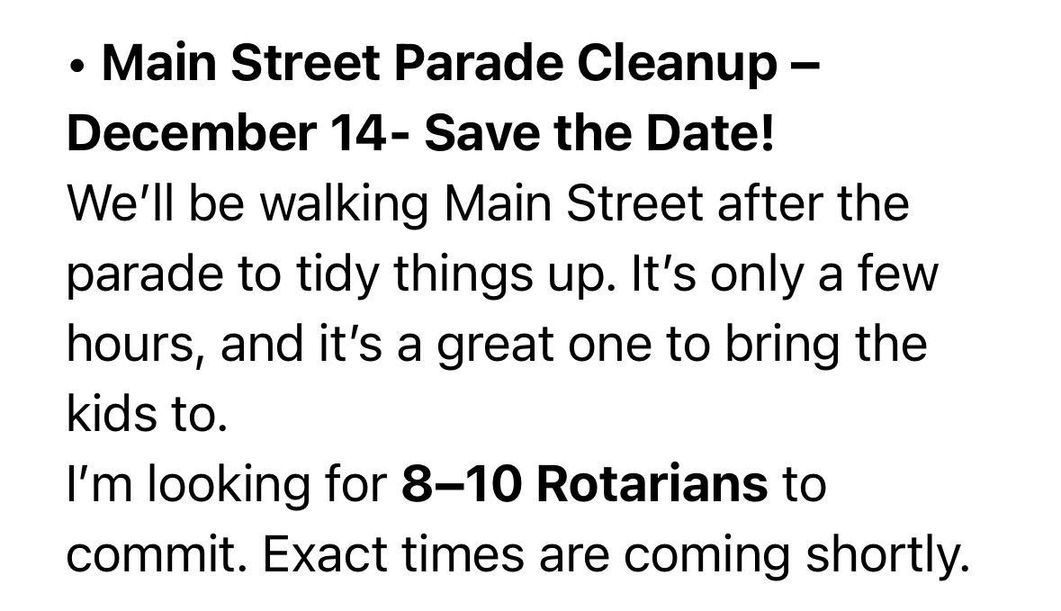 Christian Sherrill took charge of Recognition today, seeking thoughts about Club leadership. Don Huff was happy about his recent hunting trip to Roswell, New Mexico which included bagging a large buck. Bob Nakken 'rang the bell' for surviving spinal meningitis and returning home after long post operative care. Chuck Maltese returned after caring for his wife Joyce the past two months following her back surgery. Chuck said he learned a few things about how their house operates. Jayne Williams was happy about the success of the All Leaders Must Serve Annual Dinner on November 5 celebrating its 10th Anniversary of helping local young people develop workplace skills; and thanked the Club for its support. Christian then asked some past and present Club leaders what they learned on the job, and how they inspired others: Shawn Seyk (Club President 2022-23), encouraged others to serve as President as its not as hard as it looks and the club will still be here after you’re done. Current Club President Aniek Pflager was a member for over 20 years before she was ready for the job. She was thankful club members step up when asked and are really the ones doing the work. President-elect Nick Roncoroni (2026-27) was glad Bob Nakken and Karl Diekman agreed to serve as President which allowed him some time to better prepare for his term. Kevin Haarberg (2003-04) thought it important to lead by example.