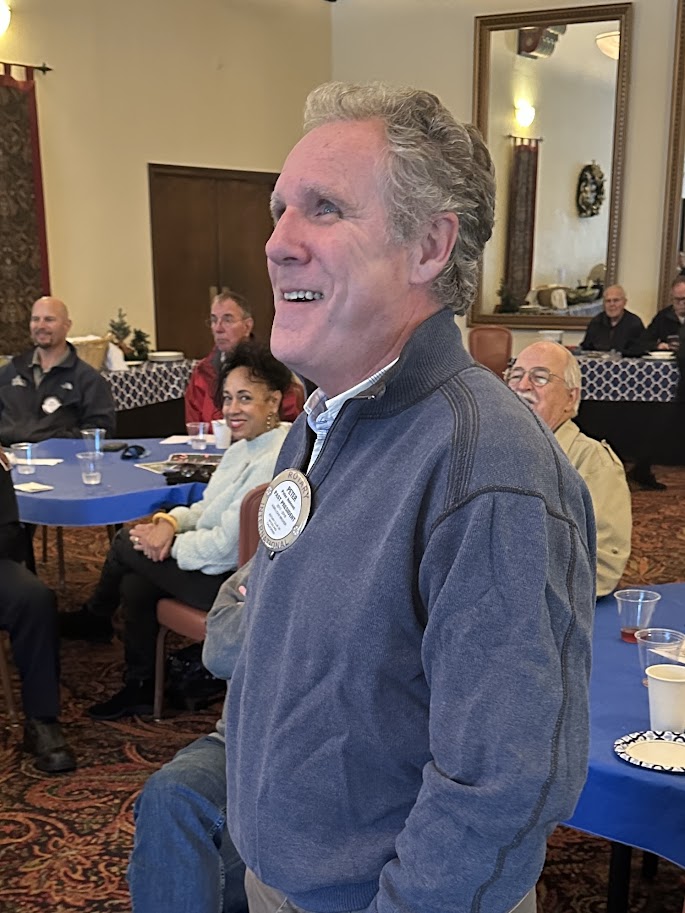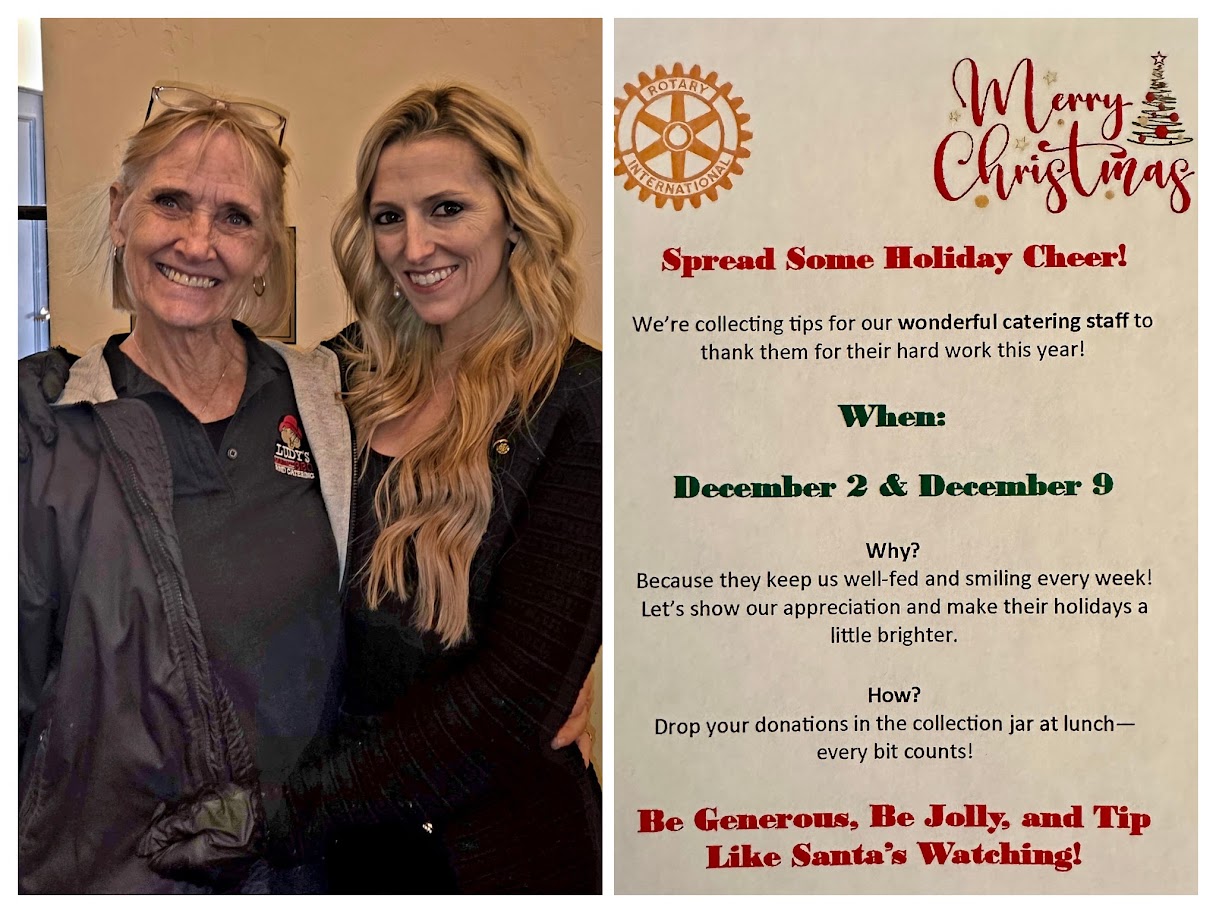 President Aniek Pflager returned to lead our meeting, and 'ring the bell', on her 56th birthday (Fresno) today! The good sized crowd on hand serenaded her with 'Happy Birthday'. President Aniek reminded us it is time for us to remember the service our lunch team of Judy Whisker and Jordi Richter has provided us this year. Be generous as you approach the tip jar at the back table.