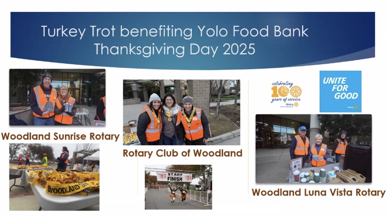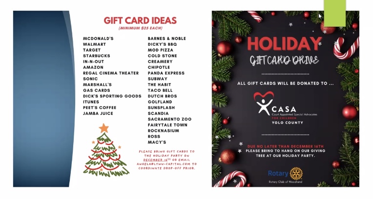 All three Woodland Rotary Clubs assisted in this year's Turkey Trot fundraiser for the Yolo Food Bank. Our Club was represented by President Aniek, Lori McGrath, Christian Sherrill, and Angela Lynn. Angela is also organizing the Gift Card Drive to benefit CASA (Court Appointed Special Advocates); bring a gift card (minimum $25 value please) from any of the noted businesses to the Club's December 16th Holiday Party at Morgan's Mill. Click here for a better view of the flyer & list of businesses.