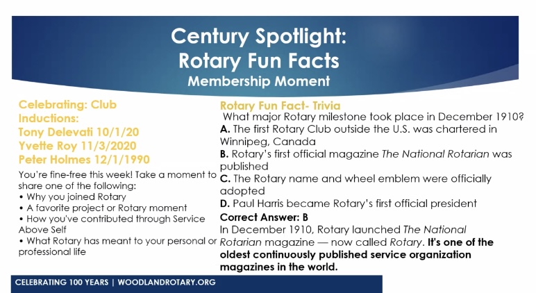 Gary Wegener was in today's Century Spotlight. He joined the Club in 1995 with Gary Wirth as his sponsor. Gary was drawn to the Club's community Involvement and as he became more familiar with the scope of Rotary International, came to appreciate all the good Rotary does in the world. We also learned the 'Splinter' nickname of our weekly newsletter was selected in 1960 inspired by the City of Woodland's 'City of Trees' motto.