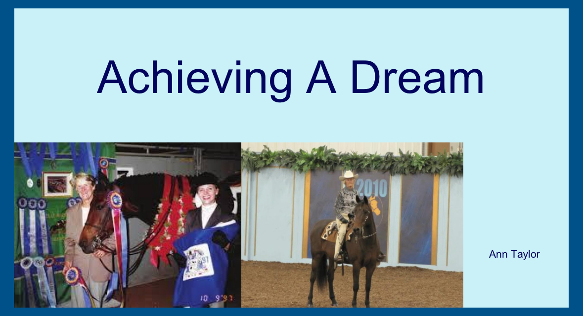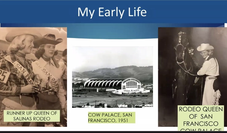 Our own Ann Taylor was our program speaker today, giving us an extended look at her inspiring personal story of working with horses, 'Achieving A Dream'. Born and raised in San Francisco, Ann became an award winning rider, owner and, later in retirement, the owner/breeder/manager of a 200 acre Stallion Station outside of Woodland.