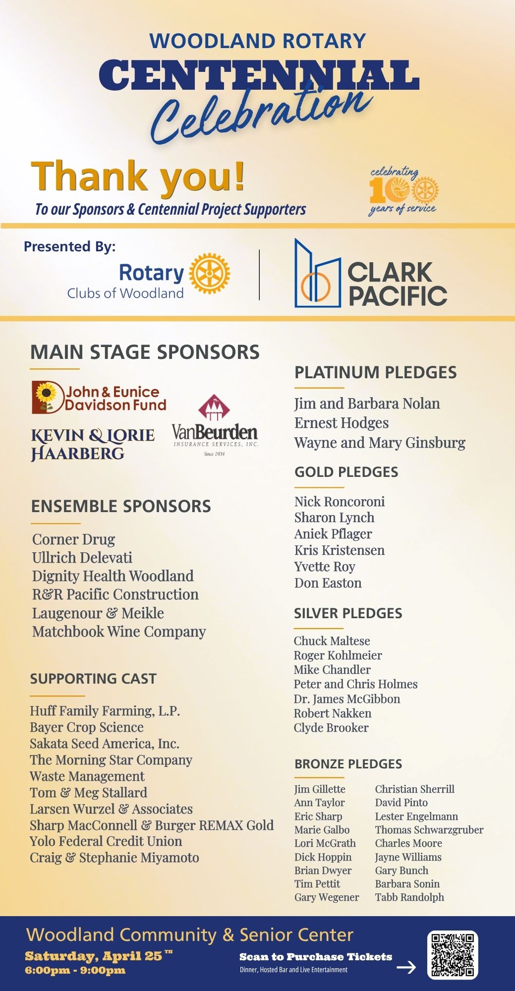 President Aniek Pflager greeted us on a beautiful Spring day with the reminder the Saturday, April 25th Centennial Celebration is a little over two weeks away. She thanked the 47 members who have pledged or purchased their tickets for the event so far. We have sold 135 Winners Choice Raffle tickets so far, with a goal of selling 300 of them to generate $30,000 for the Centennial. We want to Fill the Room that night. We currently anticipate 350 people attending, but we would like to get that total up to around 400 or more. On April 17 we need to give our food preparation team a headcount, so before then each member will be asked to confirm how many tickets they will actually be using.