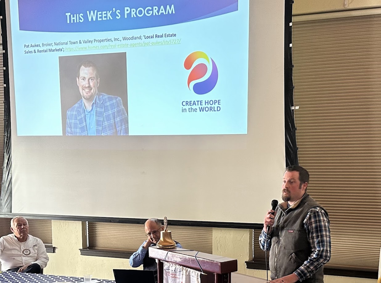 Today's meeting had a good turnout. Shawn Seyk introduced his guest and prospective new member Reggie Powell, who turned in his membership papers for consideration. Steve Venables introduced his guest Chris Stamm who moved to Woodland with his wife from Texas about 3 months ago. Kris Kristensen introduced his friend of 50 years Jim Giottonini visiting from Sparks NV. Brian Dwyer introduced his guests: Greta Eoff. Executive Director, Yolo County Association of Realtors; and Angela Lynn, Owner, Lynn Capital Group. Visiting Rotarians with us today were Don Sharp and Byron MacConnell (Woodland Sunrise) and Tracy Vicario (Portland Pearl OR).