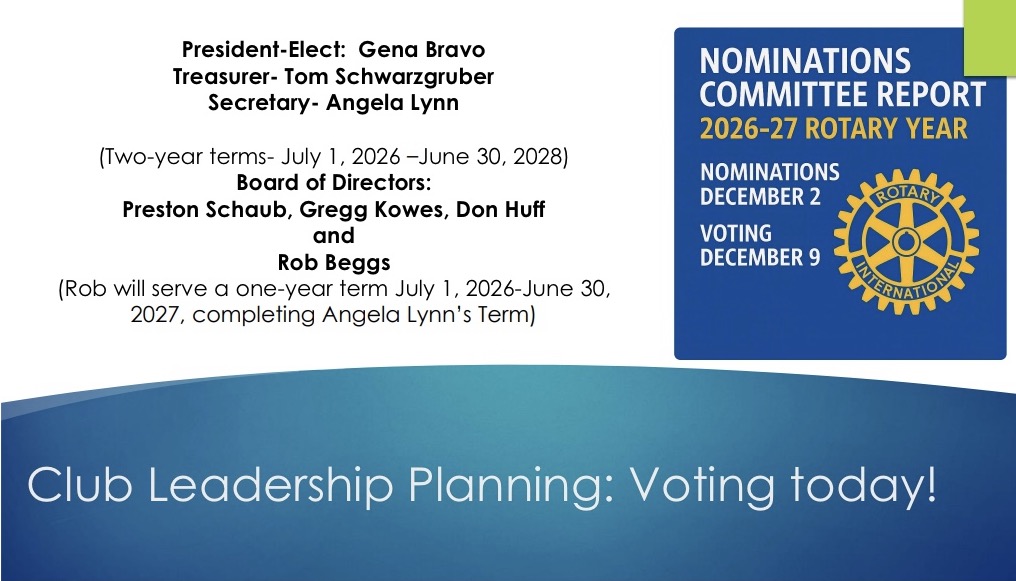 Speaking on behalf of the Club's Nominating Committee, Kris Kristensen presented the following members for nomination to Club officer positions effective July 1, 2026. The Club will hold elections of Club officers at its next meeting, December 9, 2025.