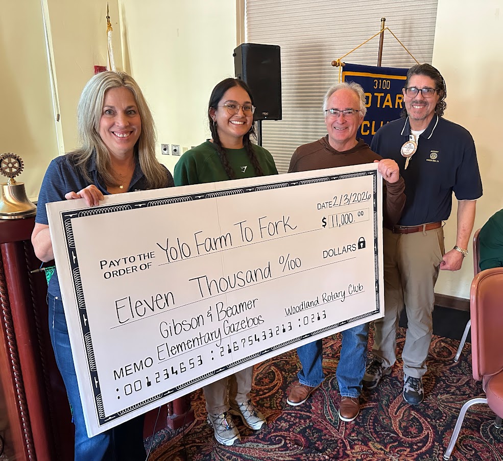 On a bright springlike day, President Aniek Pflager welcomed a good sized crowd to today's meeting. Using proceeds from the 2025 Dinner Auction, President Aniek and Immediate Past President Bob Nakken today presented a check for $11,000 from Woodland Rotary to Yolo Farm to Fork, one of the Dinner Auction's beneficiaries, to Yolo Farm to Fork representatives Jewelia Flores, Program Manager, and Jerry Delsol, Advisory Board member, for Yolo Farm to Fork's use in constructing gazebos at the learning gardens at Gibson and Beamer Elementary Schools.