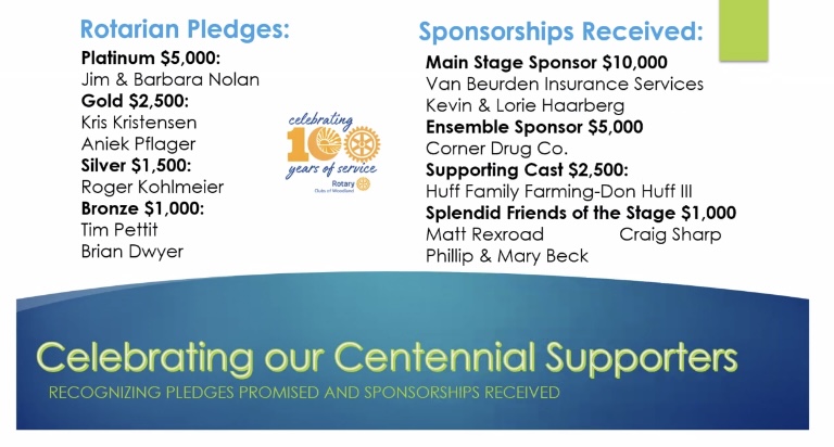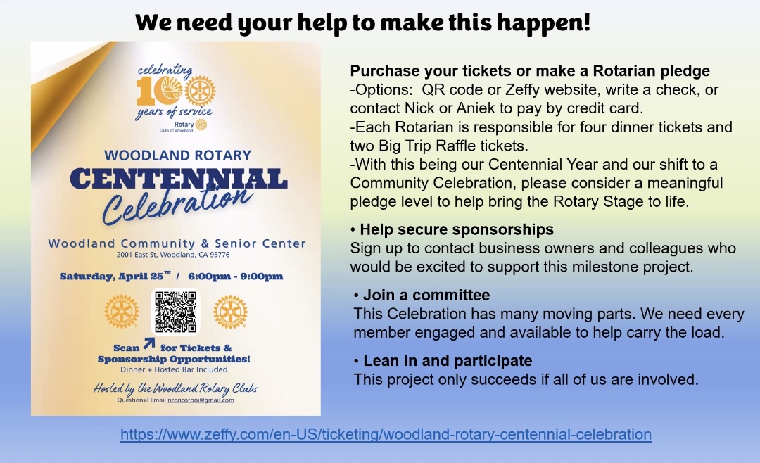 President Aniek Pflager welcomed members as preparations for the Club's Centennial Celebration & Project honoring the Club's 100th anniversary of service to the community, are well underway. President Aniek encouraged members to purchase tickets or make a Rotarian pledge for the Celebration on April 25th; help in securing sponsorships; and join a Centennial committee if you haven't already do so. This is an 'All Hands On Deck' moment for all members. Brian Dwyer asked members to go over lists of local businesses provided to identify companies you have a connection with, and sign up to contact them to seek a sponsorship. If you have any questions contact President Aniek or President-elect Nick Roncoroni. Kris Kristensen shared the news that local engineering firm Clark Pacific has offered to provide project management services for the Rotary Stage Project at the Woodland Opera House Intermission Garden, and will donate related architectural and structural services necessary to permit and construct the project. An agreement between Clark Pacific and the Woodland Rotary Endowment is being prepared to start the design work.