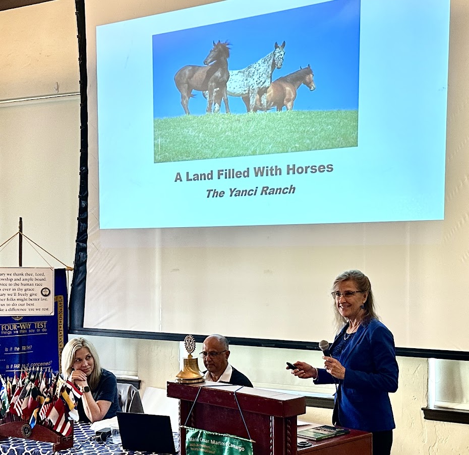 Robyn Rominger, award winning author, journalist and local historian, was our guest speaker today and discussed her most recent book, 'A Land Filled with Horses', a memior about a horse rescue operation Robyn and husband Bruce Rominger took on after inheriting a neglected herd of 30 wild horses on the 800-acre Yanci Ranch (located at the western end of County Road 27 in western Yolo County) which they had acquired. Bruce Rominger also joined us today. Thanks to Mark Ullrich for arranging for and introducing today's speaker.