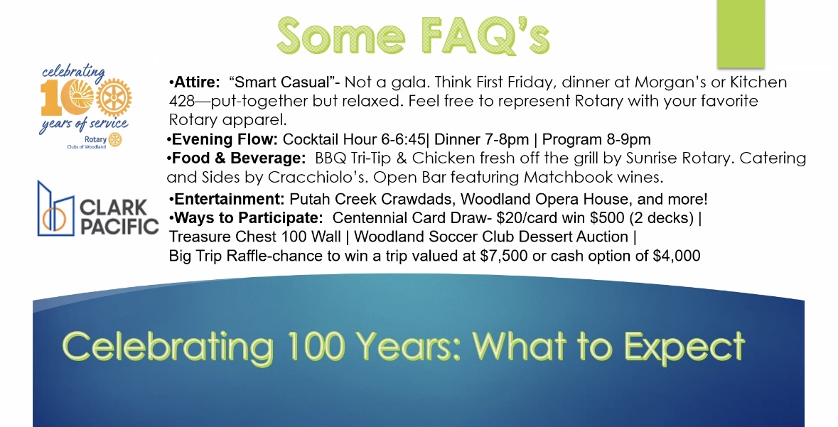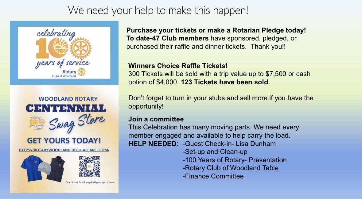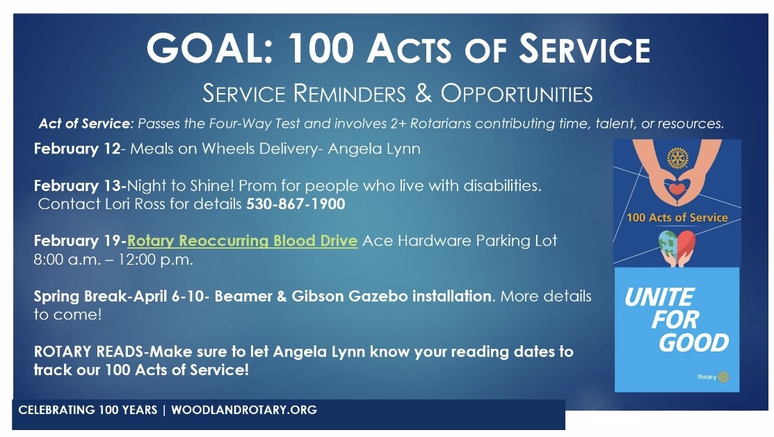 We’re on a mission! For our Centennial Year the Rotary Club of Woodland is taking on the challenge of completing 100 Acts of Service!