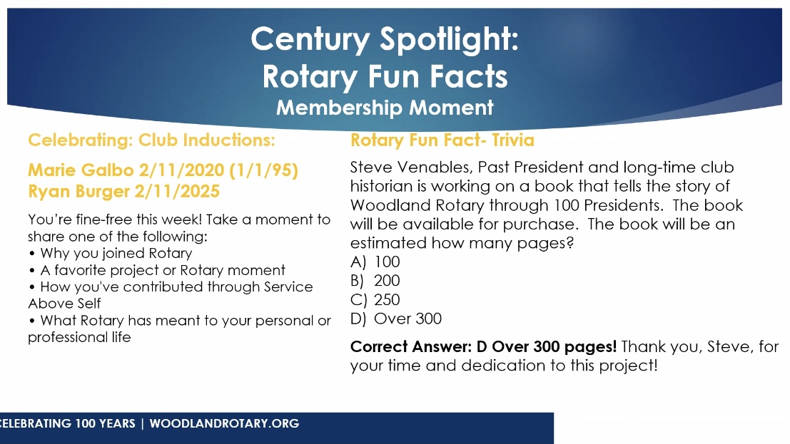 Marie Galbo and Ryan Burger were in today's Century Spotlight. Marie first became a Rotarian in 1995 with the San Ramon club which was a very active and enjoyable Club. She is a past president of the San Ramon club and remembers hosting six delegates from Russia who visited the community. Marie plans to give a program to the Club in April on the trip she and her late husband subsequently took to Russia with a delegation from the San Ramon club. After her husband passed, Marie moved to Woodland to be closer to her son and daughter in law, and she joined our Club in 2020. Rotary continues to be a positive part of Marie's life. Ryan joined the Club just last year after hearing about Rotary from his grandfather George and father Jeff. Ryan says he's inspired about what the Club does for the community. In Rotary Fun Facts we learned more about the book Steve Venables is preparing for the Club's Centennial.