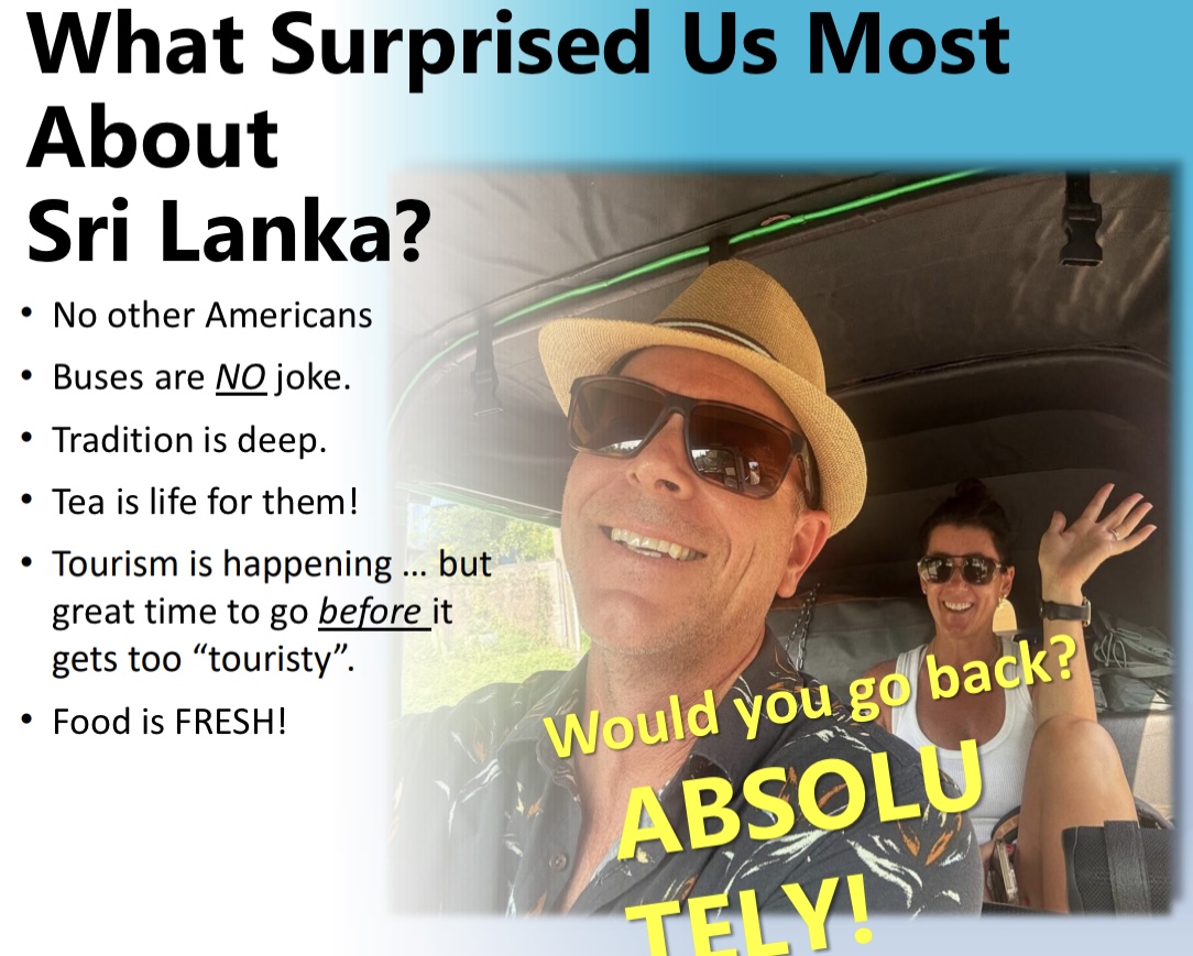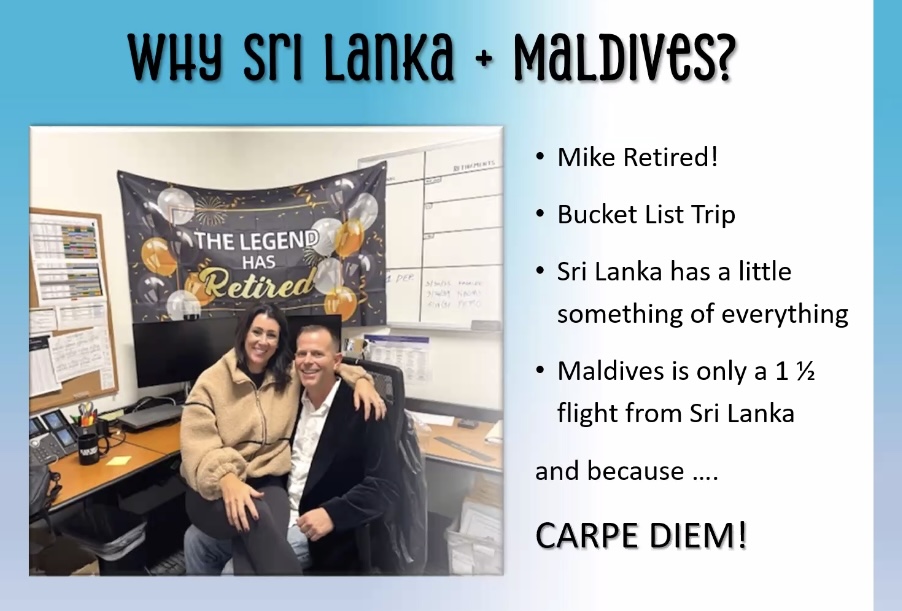 Angela Lynn was our program speaker today and gave us a dazzling look at the trip she and husband Mike took last Fall to Sri Lanka and the Maldives which is located on the other side of the world in the Indian Ocean. Use the QR code above to unlock many more photos of Angela and Mike's trip.