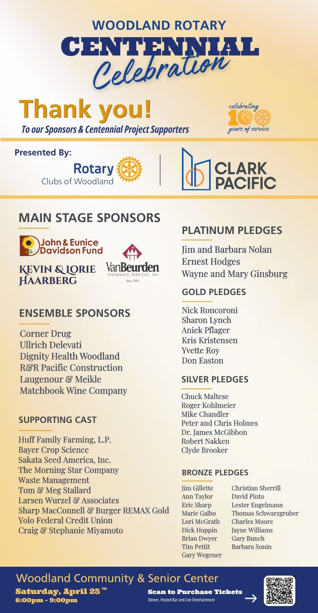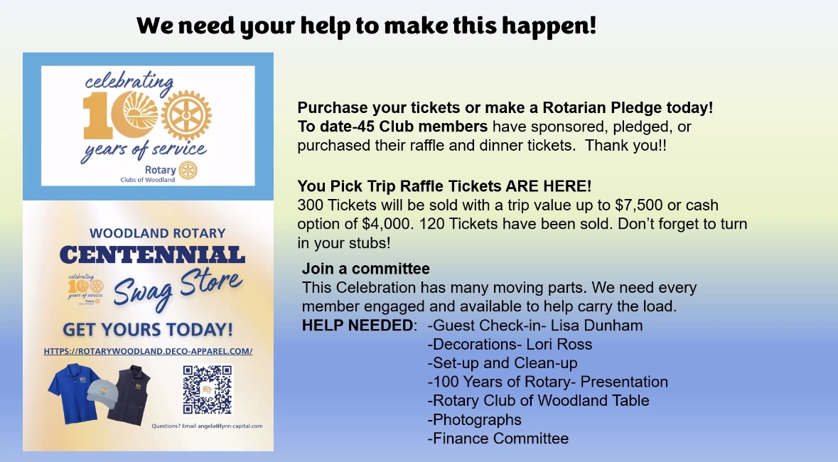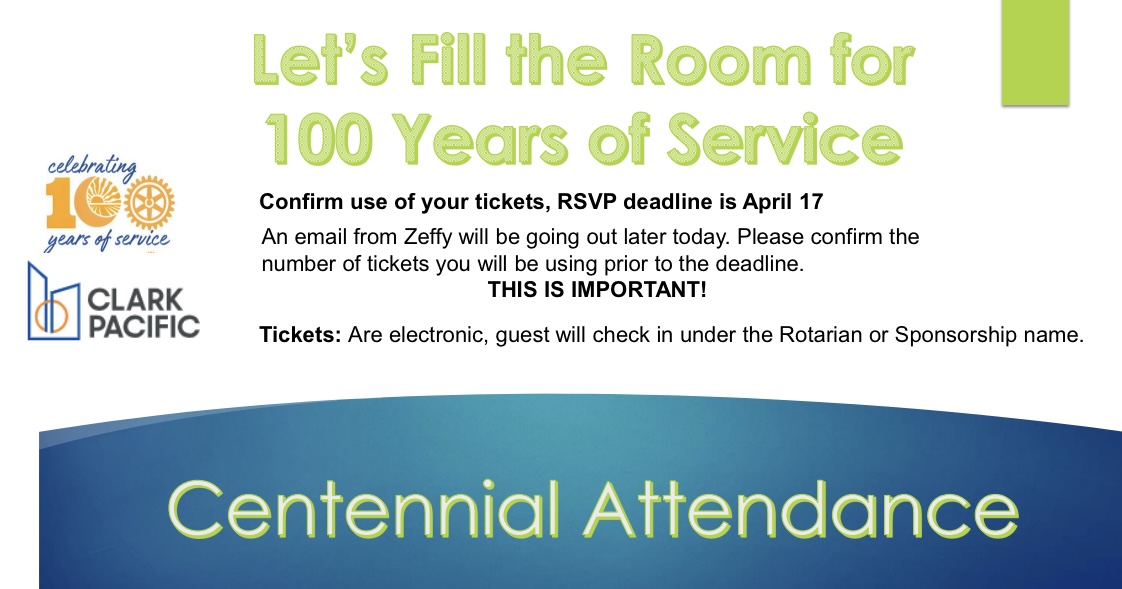 President Aniek Pflager greeted us on a beautiful Spring day with the reminder the Saturday, April 25th Centennial Celebration is a little over two weeks away. She thanked the 47 members who have pledged or purchased their tickets for the event so far. We have sold 135 Winners Choice Raffle tickets so far, with a goal of selling 300 of them to generate $30,000 for the Centennial. We want to Fill the Room that night. We currently anticipate 350 people attending, but we would like to get that total up to around 400 or more. On April 17 we need to give our food preparation team a headcount, so before then each member will be asked to confirm how many tickets they will actually be using.