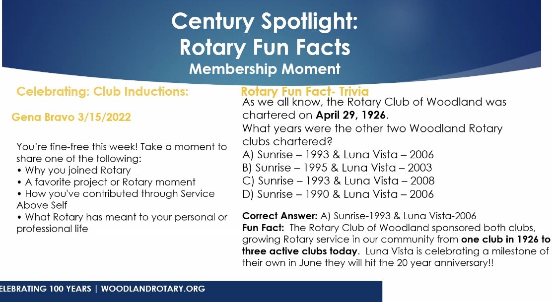 President-Nominee Gena Bravo was in today's Century Spotlight. Gena joined our Club in March 2022 with Mike Chandler as her sponsor. Gena is committed to volunteering time, talent and treasure in different stages of her life. She has enjoyed meeting members of the Club. Gary Wegener 'rang the bell' today, after remembering to bring the check he had written a few weeks back for his birthday. Joe Cadelago celebrated his 47th birthday on March 19 (Vallejo).