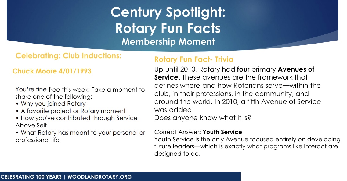 Chuck Moore was in today’s Century Spotlight. He said he didn’t know anything about Rotary, but was ‘told’ to join and did so in 1993. He didn’t know the extent of what Rotary did, and the fellowship that was part of the experience. Chuck said his Rotary membership ‘has been a very good thing for me personally’. In Rotary Fun Facts we learned that ‘Youth (New Generations) Services’ became Rotary International’s fifth Avenue of Service in 2010, joining the original four Avenues – Club Service, Vocational Service, Community Service and International Service.