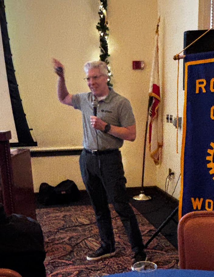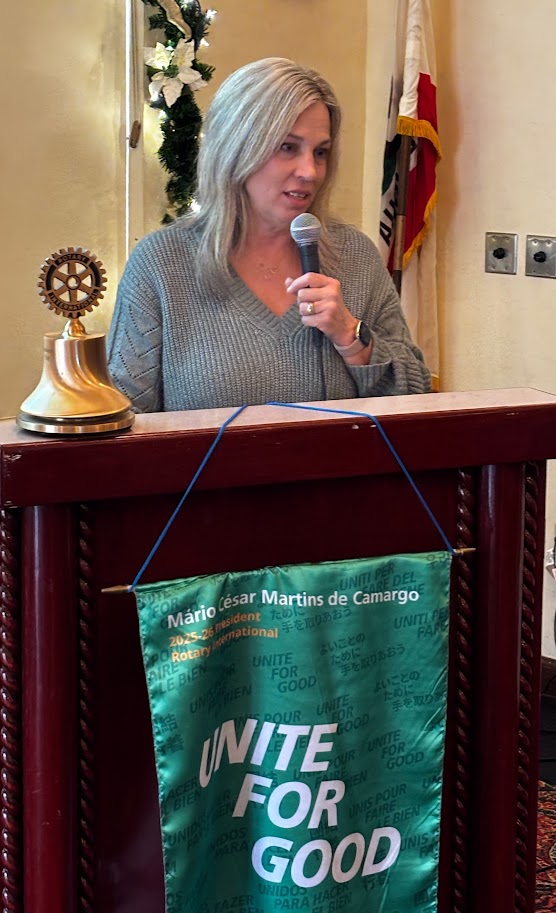 President Aniek Pflager returned to lead our meeting, and 'ring the bell', on her 56th birthday (Fresno) today! The good sized crowd on hand serenaded her with 'Happy Birthday'. President Aniek reminded us it is time for us to remember the service our lunch team of Judy Whisker and Jordi Richter has provided us this year. Be generous as you approach the tip jar at the back table.