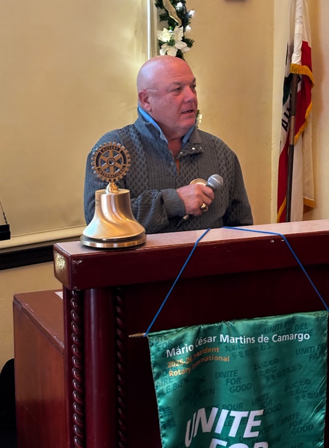 Mark Ullrich took charge of today's Recognition. Roger Kohlmeier was happy with the recent success of the SF 49ers; Mark thanked Lori McGrath for her support of the Club and her work with ALMS; Jayne Williams was very happy to have all her grandchildren home with her at Thanksgiving; Christian Sherrill was happy about his son's running success at the Turkey Trot; Angela Lynn and her husband Mike returned from a great trip to Sri Lanka and the Maldives; and David Pinto is a fan of Chelsea football and the SF 49ers.