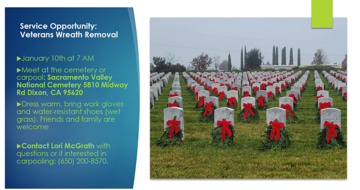 Our Club has a wonderful service opportunity to help remove the wreaths from the Sacramento Valley National Cemetery early this Saturday morning January 10. If you would like to volunteer or have questions, please respond to this email or call or text Lori McGrath at (650) 200-8570.
